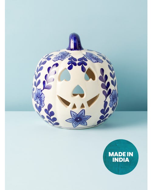 This blue and white ceramic pumpkin is so beautiful I might just leave it up year-round! On the back of the sculpture is an opening for a tealight candle as well, so you can cast a spooky glow over your mantel or tablescape.