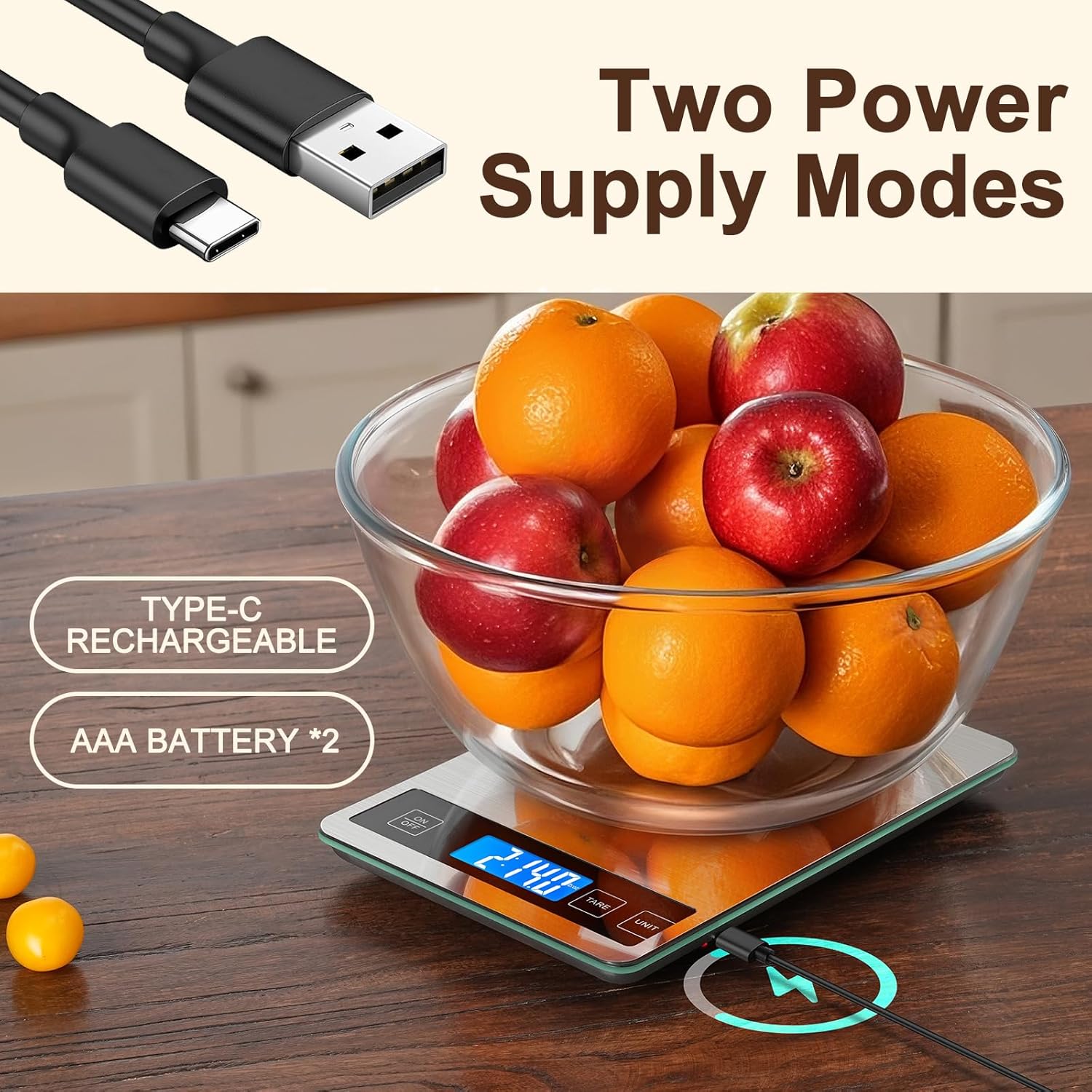 [ Dual Power Supply ]: This food scale contains a built-in lithium battery that can be charged via a USB cable, you can also use AAA batteries. Accessories: USB cable, AAA battery*2